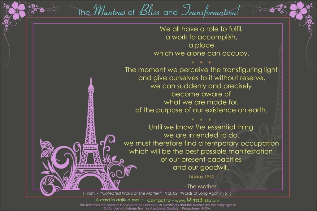 For, in books of this kind (Mother shows The Synthesis of Yoga), books of revelation, there is always an accumulation of forces - at least of higher mental forces, and most often of spiritual forces of the highest knowledge. Every book, on account of the words it contains, is like a small accumulator of these forces. People don't know this, for they don't know how to make use of it, but it is so. In the same way, in every picture, photograph, there is an accumulation, a small accumulation representative of the force of the person whose picture it is, of his nature and, if he has powers, of his powers. Now, you, when you are sincere and have an aspiration, you emanate a certain vibration, the vibration of your aspiration which goes and meets the corresponding force in the book, and it is a higher consciousness which gives you the answer.