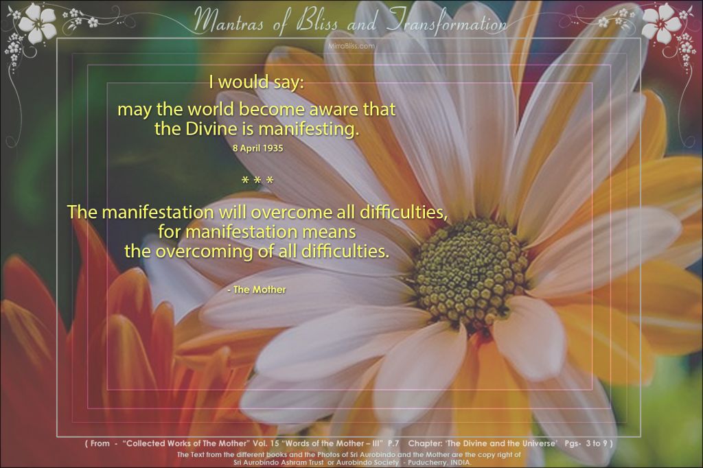 The entire physical being would like to be dissolved and reconstituted in an adoration that would have no bounds. O Lord, Thou who comest to touch Matter as the Messenger of the Supreme Power and Supreme Beatitude, Thou createst the conception of what the total realisation can be. And when the being believed it was definitively invested with Thy sublime mandate, Thou withdrawest, making it understand that it was only a promise, a token of what can be. Alas, what an imperfection in Matter it is that we cannot hold Thee! O Lord, use Thy omnipotence, work the miracle of Thy permanent Presence.... Why so much consideration? We must triumph or perish!...