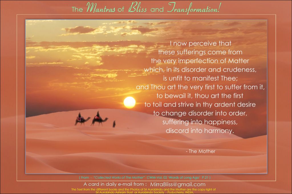 Thou art consciousness and light, Thou art peace in the depth of all things, the divine love that transfigures, the knowledge that triumphs over darkness. To feel Thee and aspire to Thee one should have emerged from the immense sea of the subconscient, one should have begun to crystallise, to grow distinct so as to know oneself and then give oneself as that alone which is its own master can do. And what effort and struggle it takes to attain this crystallisation, to emerge from the amorphous state of the environment; and how much more effort and struggle yet to give oneself, to surrender once the individuality has been formed.