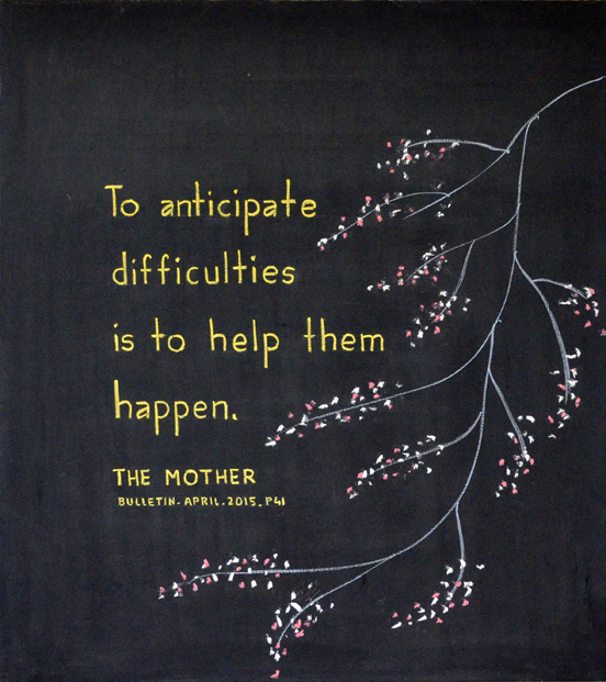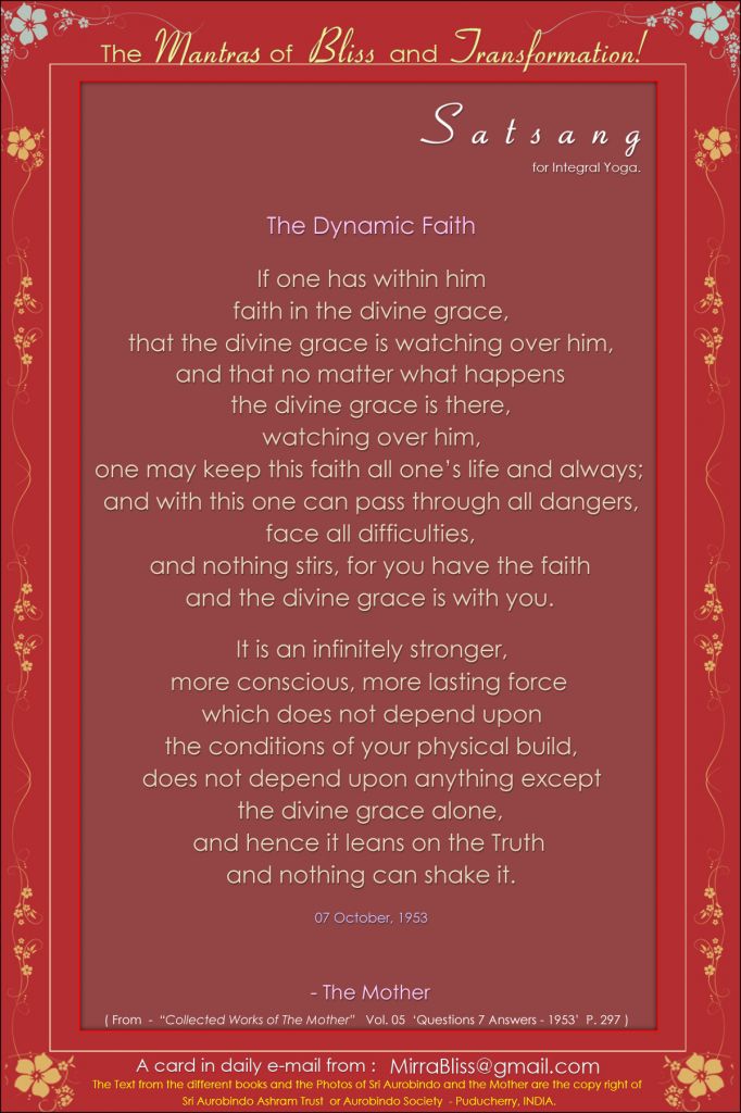 The first word represents: the supreme invocation the invocation to the Supreme. The second word represents: total self-giving; perfect surrender. The third word represents: the aspiration, what the manifestation must become—Divine.