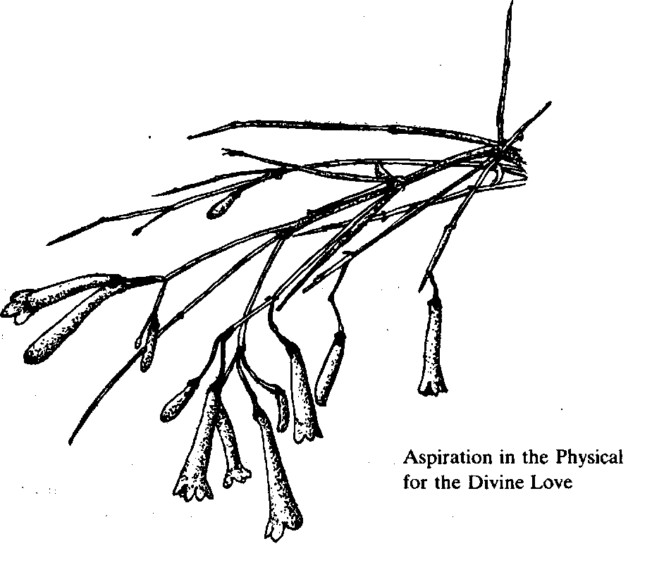 The movement of love is not limited to human beings and it is perhaps less distorted in other worlds than in the human. Look at the flowers and trees. When the sun sets and all becomes silent, sit down for a moment and put yourself into communion with Nature: you will feel rising from the earth, from below the roots of the trees and mounting upward and coursing through their fibres up to the highest outstretching branches, the aspiration of an intense love and longing,—a longing for something that brings light and gives happiness, for the light that is gone and they wish to have back again. There is a yearning so pure and intense that if you can feel the movement in the trees, your own being too will go up in an ardent prayer for the peace and light and love that are unmanifested here.