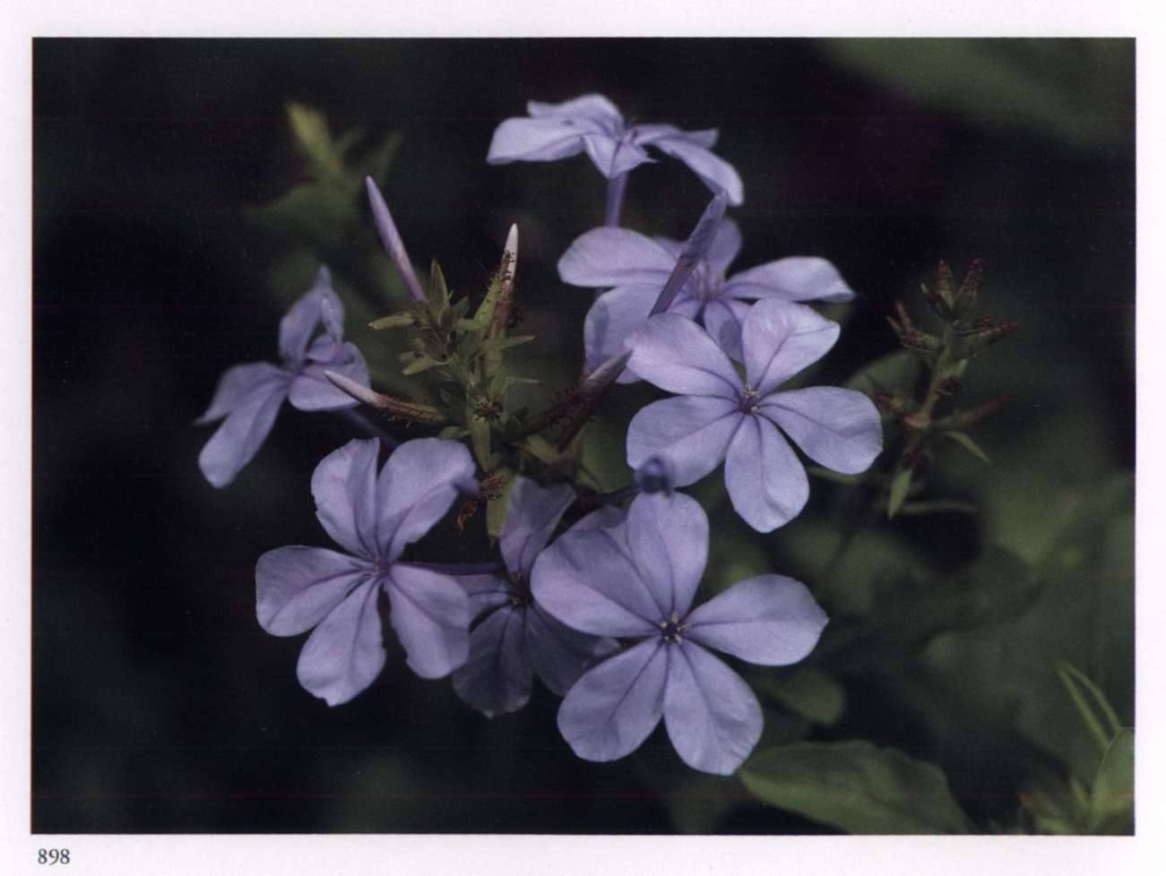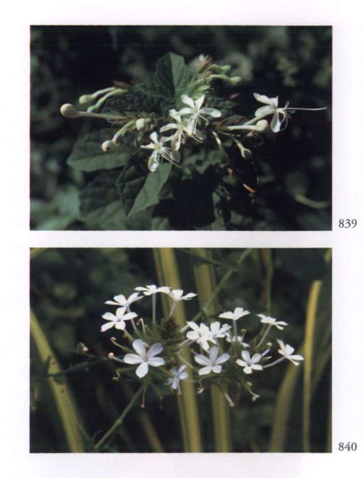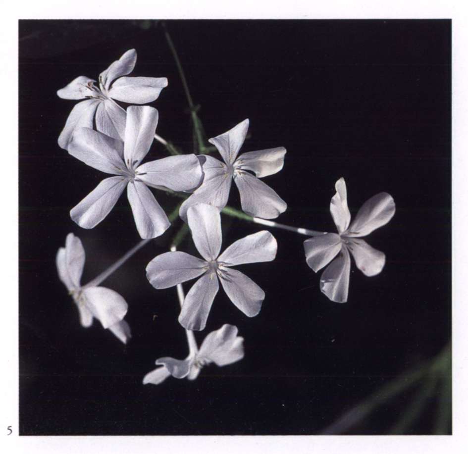 898 Krishna's Ananda Manifold, abundant and so full of charm. Plumbago auriculata Lam. Plumbaginaceae Cape leadwort Small soft pale lavender blue salverform flower with a very thin long corolla tube and a limb divided into five widely separated lobes; borne in terminal clusters. An evergreen shrub with semi-scandent stems.