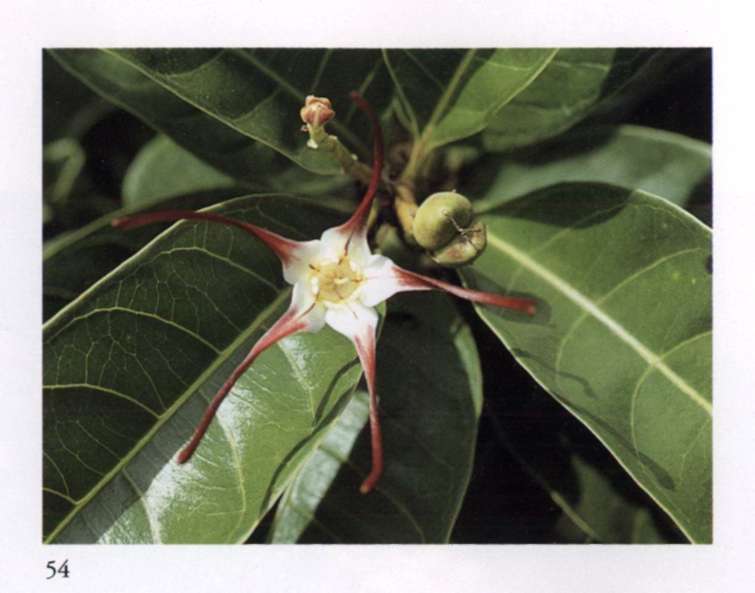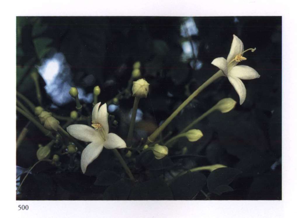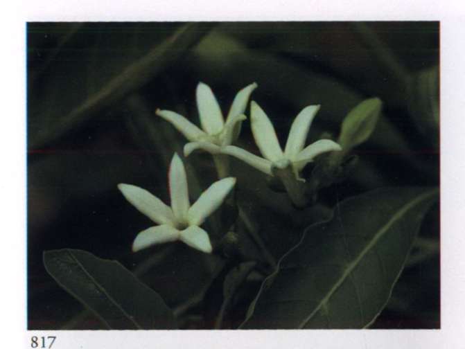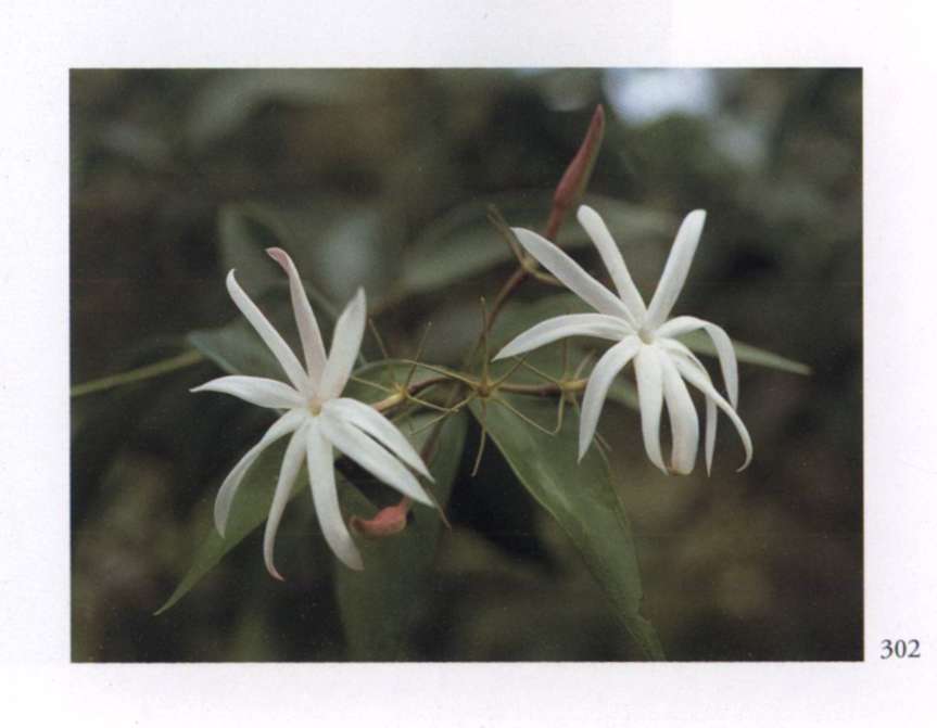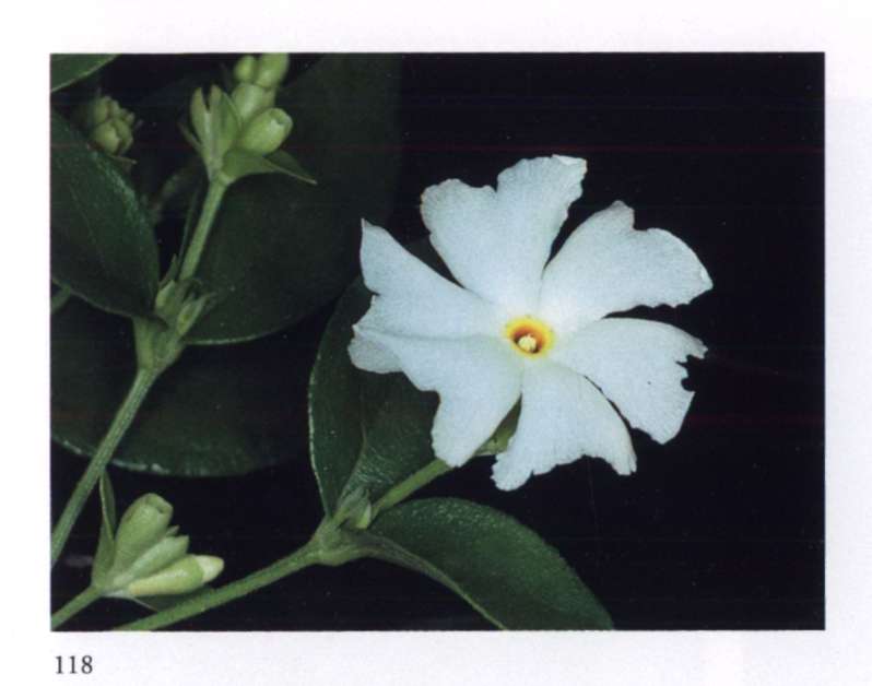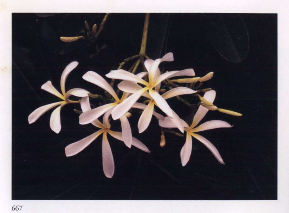 860 Rising star Let us hope it is the right one. Aganosma roxburghii Apocynaceae Small fragrant white salverform flower with five overlapping petal-like lobes forming a pinwheel and a narrow yellow tube arising from a prominent star-shaped calyx; borne in large rounded terminal corymbs. A moderately large vine with red-veined leaves.