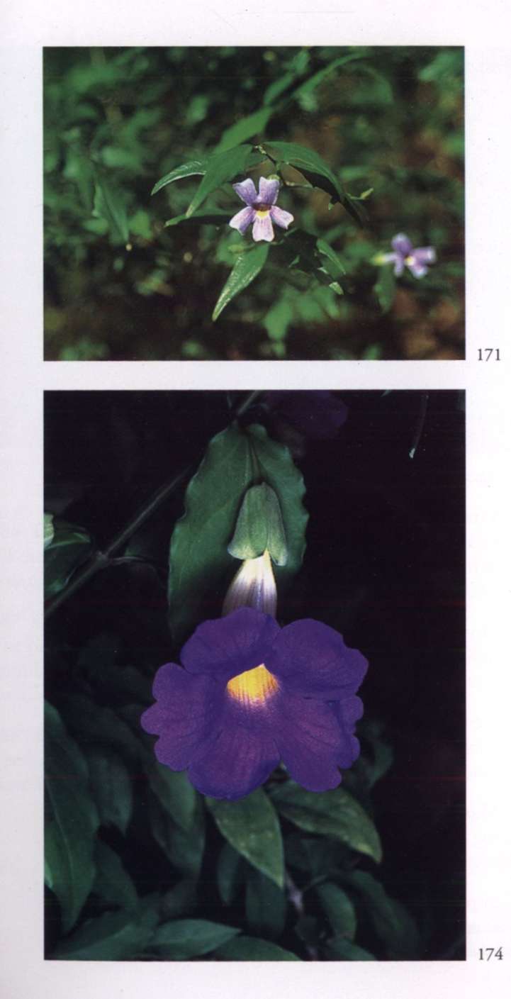 887 Krishna's light in the mind A charming way to become intelligent. Thunbergia grandiflora (Roxb. ex Rottl.) Roxb.Acanthaceae Blue trumpet vine, Clock vine, Bengal clock vine, Sky vine Large light lavender salverform flower with a broad limb divided into five rounded lobes, a soft yellow centre and a corolla tube that emerges from two prominent green bracts; borne in pendulous racemes. A vigorous vine with dense rough foliage.