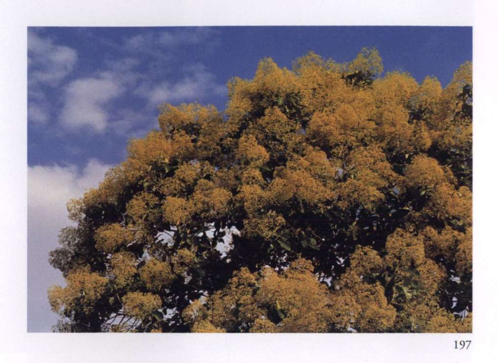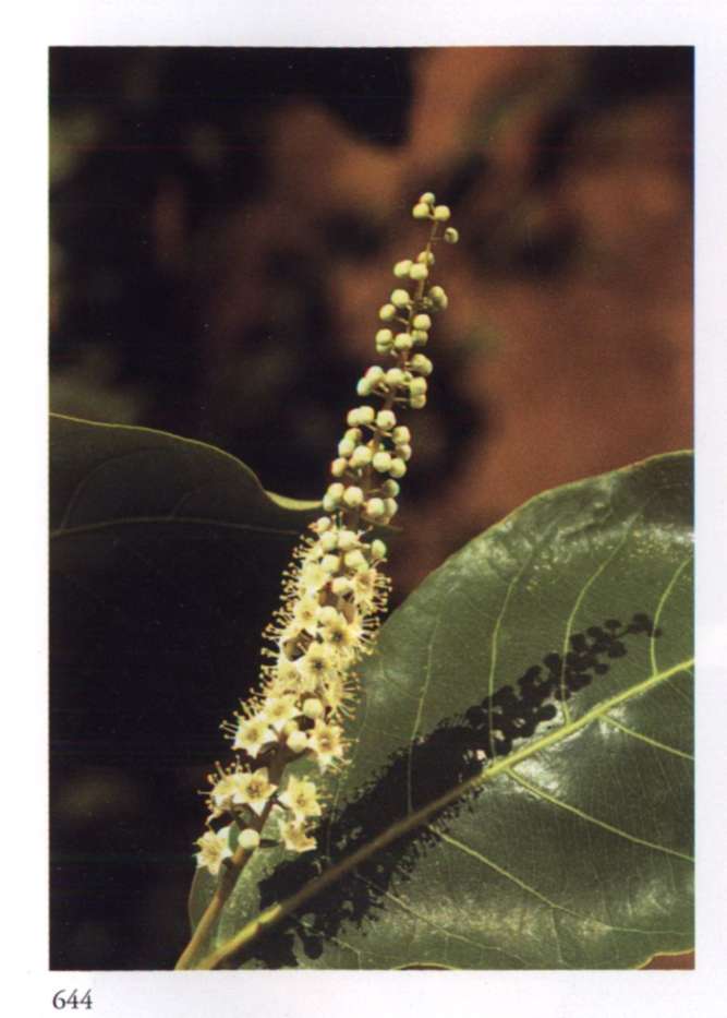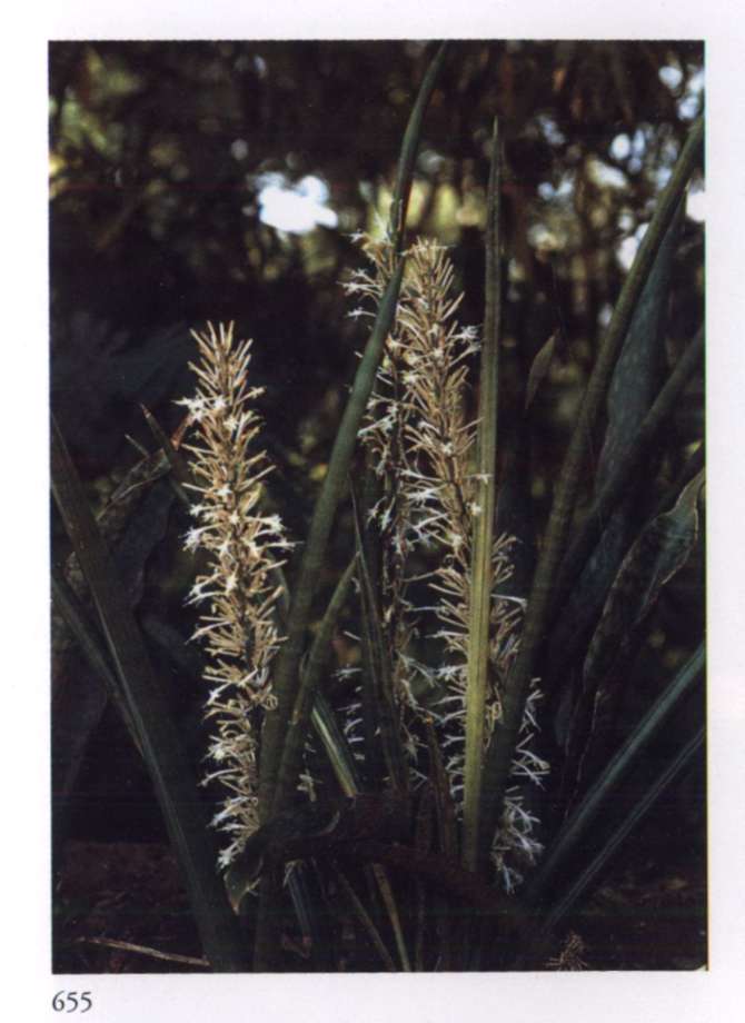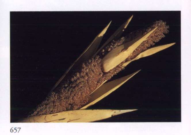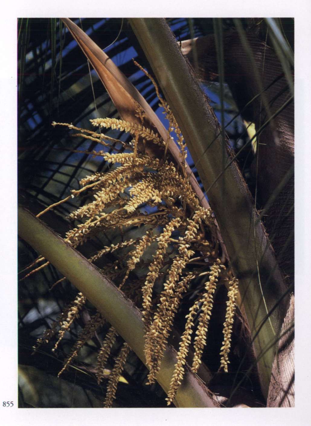 855 Multitude Gives itself freely and satisfies innumerable needs. Cocos nucifera L. Palmae Coconut Large branched clusters of densely studded spikes with small pale golden orange flowers that have