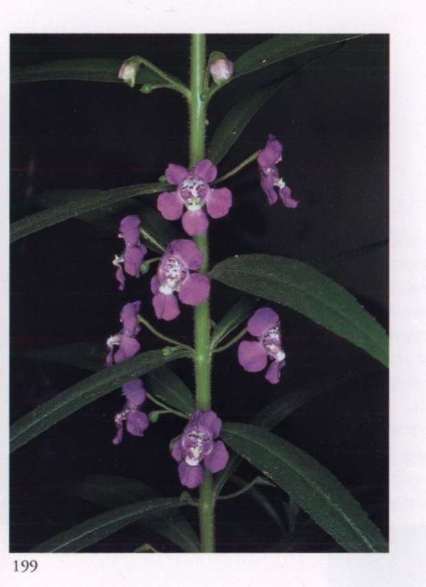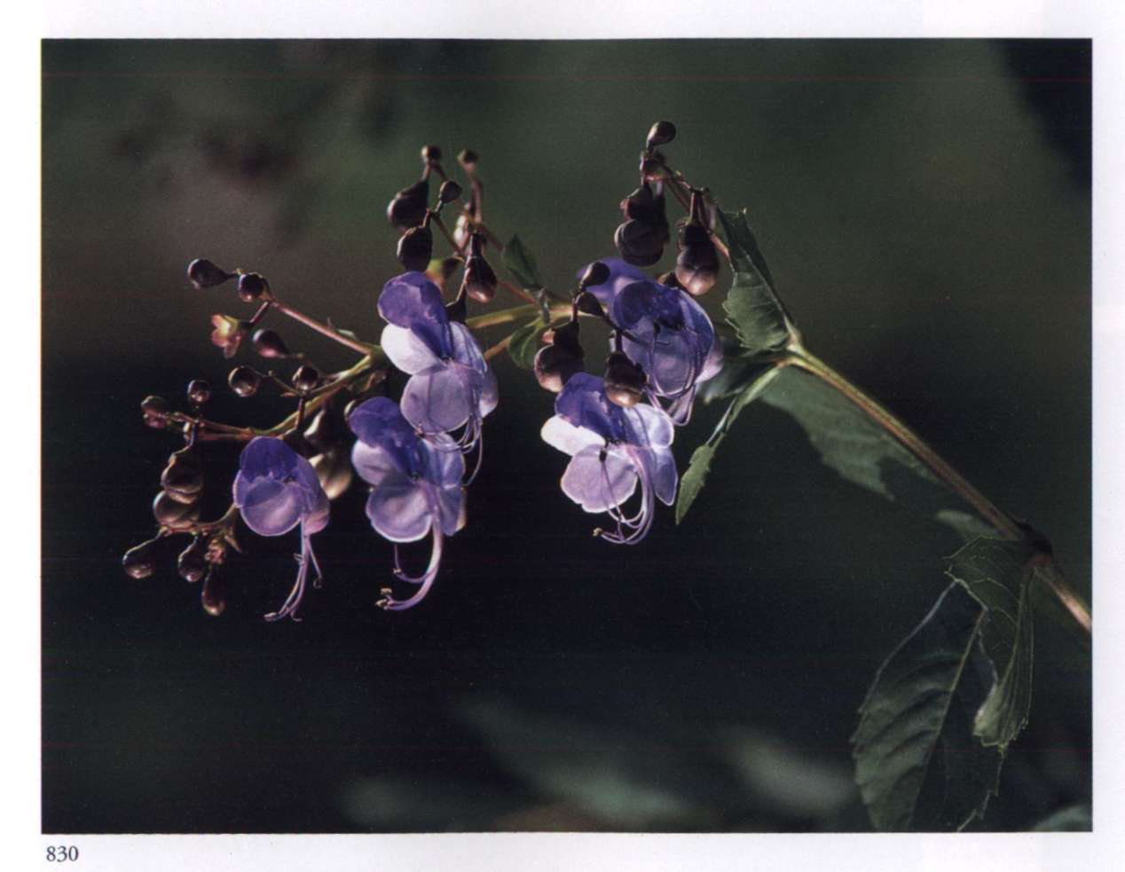895 Krishna's play A power of progress veiling itself behind appearances. Torenia fournieri Lind. ex E. Fourn. Scrophulariaceae Wishbone flower, Bluewings Small salverform flowers with a flattened corolla tube and a limb irregularly divided into one larger crimped upper lobe and three smaller lower lobes; hybrid forms in white, mauve or lavender; the prominent calyx is light green and ribbed; borne singly in the leaf axils or in few-flowered terminal racemes. A low delicate annual herb.