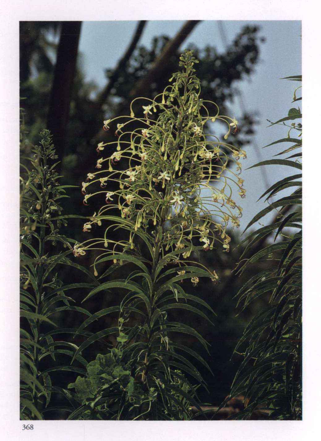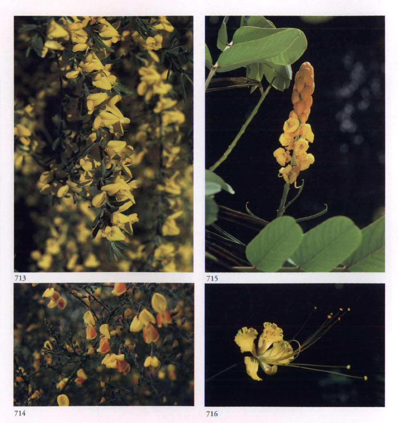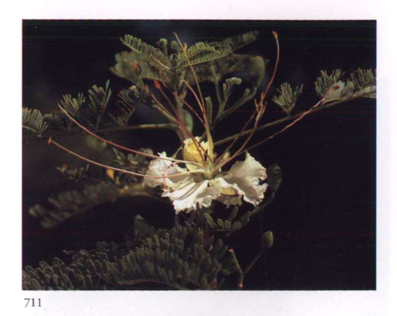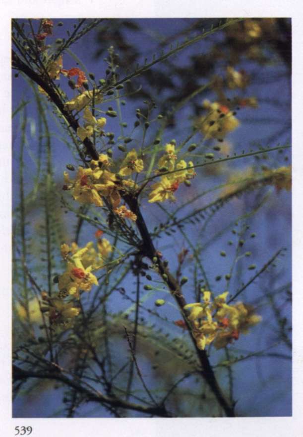 882 Fire Fears no obstacle. Caesalpinia pulcherrima (L.) Swartz.Leguminosae (subfamily Caesalpinioideae) Barbados pride, Paradise flower, Peacock flower, Barbados flower fence Small striking flower with four equal petals, a smaller lip and very long prominent stamens; in orange red with a yellow to orange yellow border; borne in erect racemes. A large somewhat prickly shrub.
