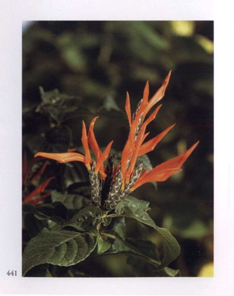 872 Matter aspiring for the supramental guidance Dissatisfied and troubled, Matter asks for a powerful guide to put it in order. Odontonema strictum (Nees) Kuntze. Acanthaceae Small red curving tubular flower with five irregularly separated flaring lobes; borne in erect branching racemes. A small to medium shrub with wavy-edged leaves.