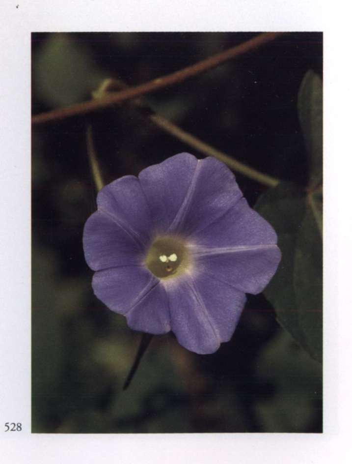 885 Radha's consciousness in the vital Perfect attachment to the Divine replaces all vital attractions and passions. Clitoria ternatea L. Leguminosae (subfamily Papilionoideae) Blue pea, Blue vine, Butterfly pea, Pigeon wings, Mussel-shell creeper Single light purple flower. Further description see Radha's consciousness (884).