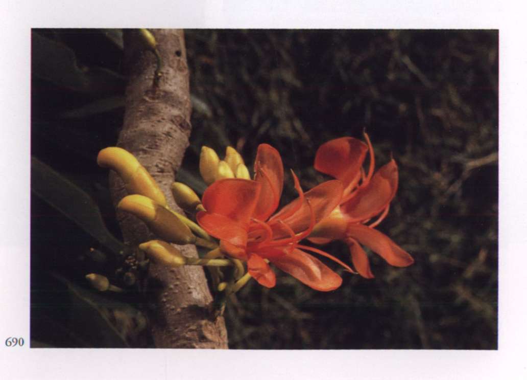 871 Matter prepares itself to receive the Supramental Matter strives to free itself from old habits in order to prepare for the new realisation. Erythrina variegata (L.) Merrill. var. orientalis Leguminosae (subfamily Papilionoideae) Coral tree Medium-sized bright orange flowers with long exserted orange red stamens; the leaves are heavily variegated with yellow along the veins and midrib. A large deciduous tree.