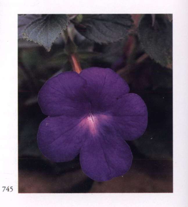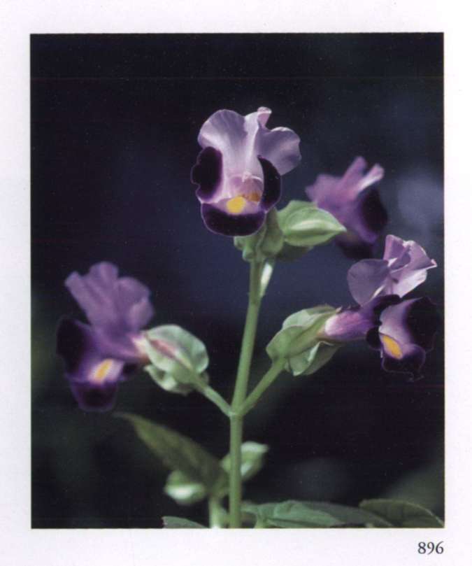 896 Krishna's play in Matter Beauty, love and joy are His companions. A play that widens and makes us progress. Torenia fournieri Lind. ex E. Fourn. Scrophulariaceae Wishbone flower, Bluewings Pale lavender flower edged with deep velvety purple and a yellow spot in the centre of the lower lobe. Further description see Krishna's play (895).