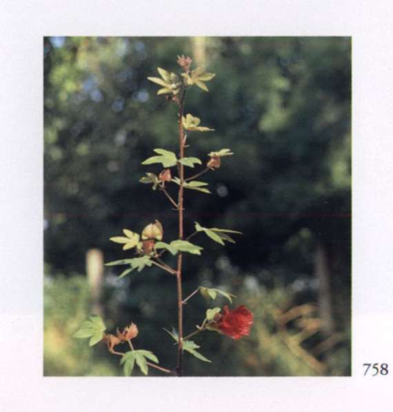 876 Material abundance Nature always shows us what true abundance is — one is overwhelmed! Gossypium L. spp. Malvaceae Cotton Medium-sized yellow or cream white somewhat cup-shaped flower with five sheer overlapping petals, occasionally with a purple red spot at the base; set in conspicuous green fringed bracts on short stems in the leaf axils. An annual or perennial herb or shrub.