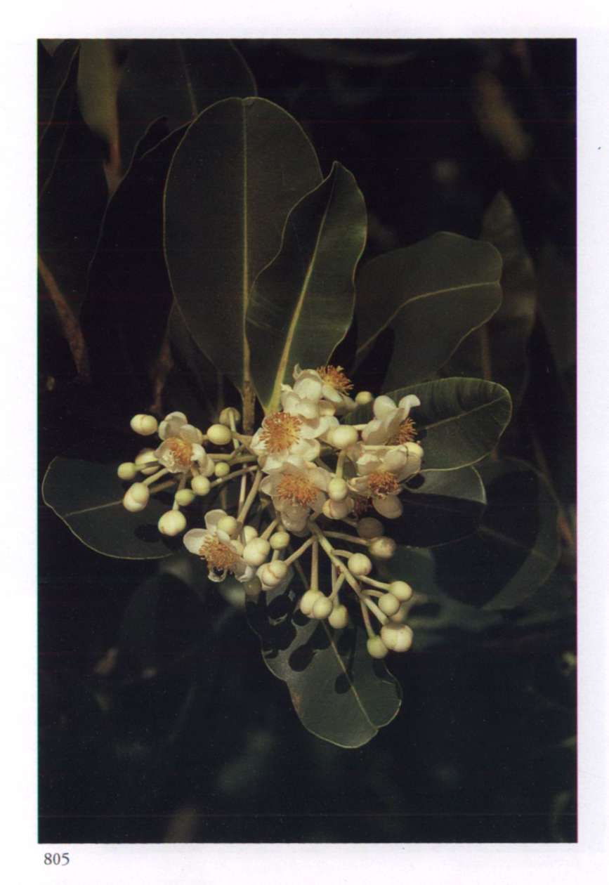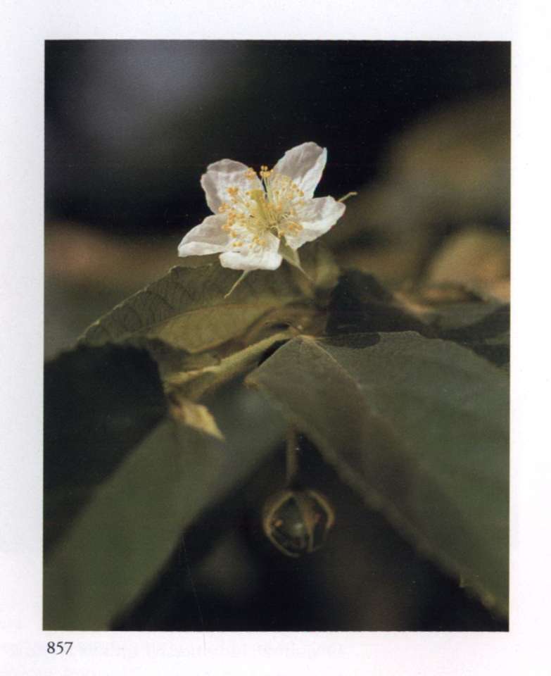 857 Primitive succulence Pleasing to a simple taste. Muntingia calabura L. Elaeocarpaceae Calabur, Jamaican cherry Small white saucer-shaped flower with five delicate separated petals and a small green cone-shaped pistil surrounded by numerous tiny yellow-tipped stamens; borne singly. The small round pinkish edible fruit is included in the significance. An extremely fast-growing but short-lived tree with an umbrella crown and tomentose leaves.