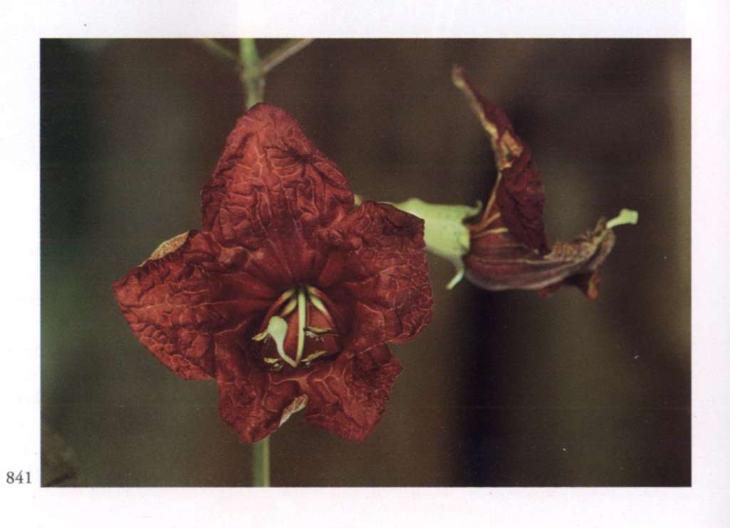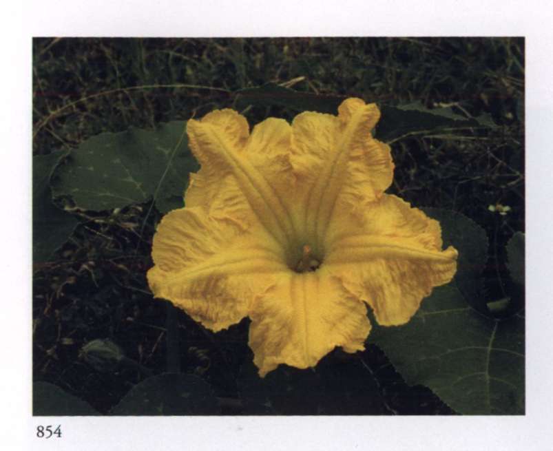 854 Abundance All at once Nature gives much to us and we have the joy of abundance. Cucurbita maxima Duchesne ex Lam. Cucurbitaceae Autumn squash, Winter squash, Pumpkin Large golden yellow somewhat fleshy funnel-shaped flower with a spreading limb divided into six pointed lobes, a throat covered with fine hairs and the back of the flower prominently ribbed with green; borne singly. A vigorous annual vine.