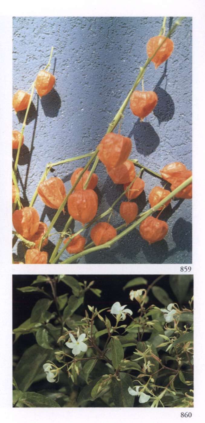 859 Sun-drop Luminous and lovely, it brings joy. Physalis alkekengi L. Solanaceae Chinese-lantern, Winter cherry, Bladder cherry Small showy orange red lantern-shaped persistent calyx surrounding a globose berry; borne singly in the leaf axils. A herbaceous perennial, sometimes grown as an annual.