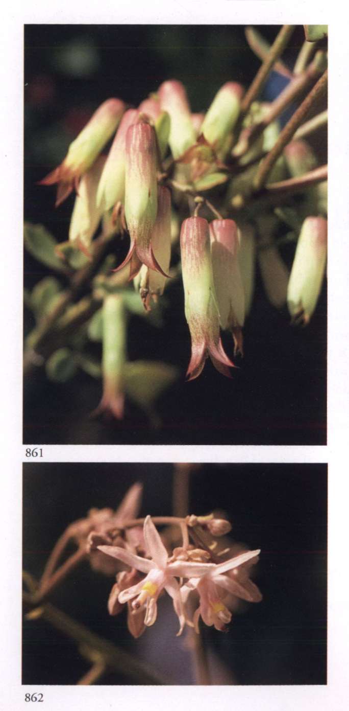 861 Light in fairyland The fairies are ready to let themselves be guided by the Divine. Kalanchoe pinnata (Lam.) Pers. Crassulaceae Air plant, Life plant, Floppers Small pendulous yellow green narrow tubular calyces shaded purple red at the base; the four pointed green petals tinged light red are barely visible at the tip of the calyx; borne in dense clusters. A succulent perennial herb with thick fleshy leaves that produce young plants at their tips.