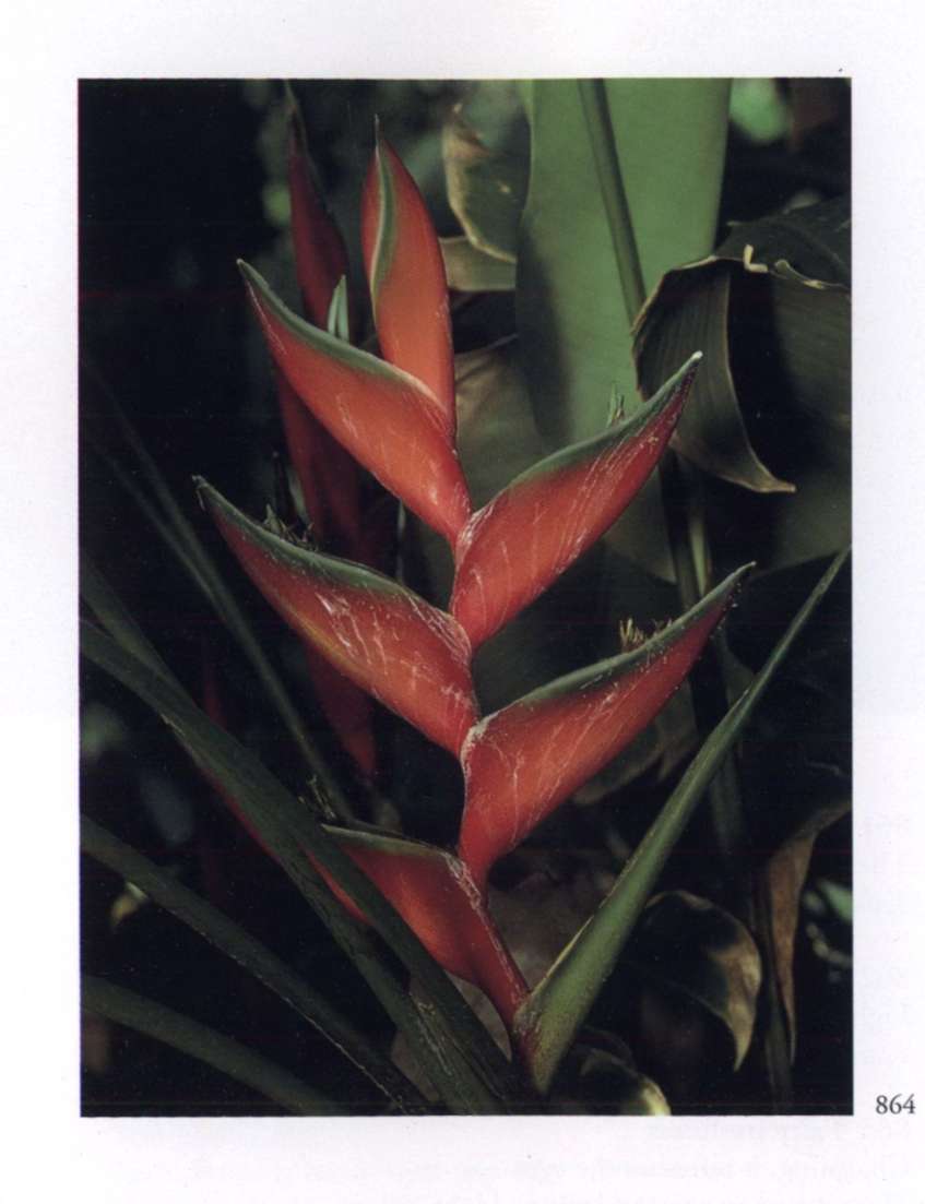 864 Bird of paradise A bird that never flies away. Heliconia L. sp. Musaceae False bird of paradise, Lobster claw, Wild plantain Large sturdy erect orange red bracts, somewhat boat-shaped or resembling a lobster claw, enclosing small inconspicuous pale green flowers and arranged alternately in a terminal inflorescence. A clumping rhizomatous herb with leaves that are similar to those of the banana plant.
