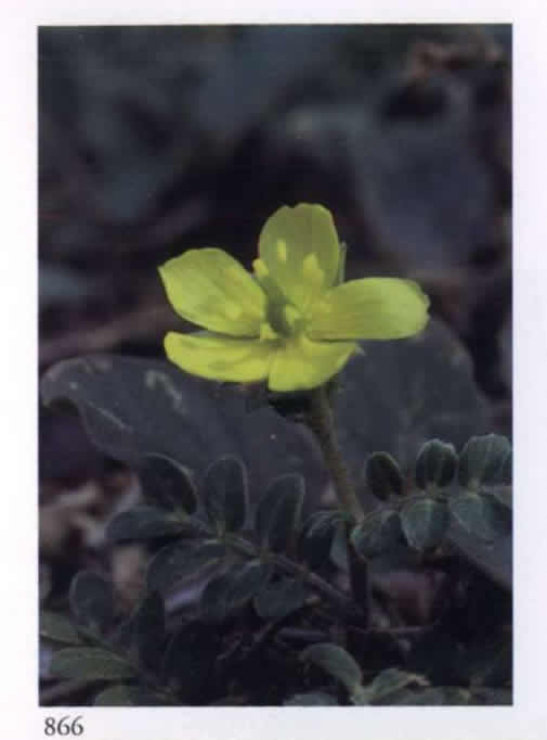 866 First mental awakening in Matter It has preceded and prepared man's future upon earth. Tribulus terrestris L. Zygophyllaceae Caltrop, Devil's weed, Puncture vine, Burnut Small yellow saucer-shaped rotate wayside flower with five spreading overlapping petals; borne singly from the leaf axils. A mostly prostrate annual or perennial herb bearing hard nutlets with sharp spines.