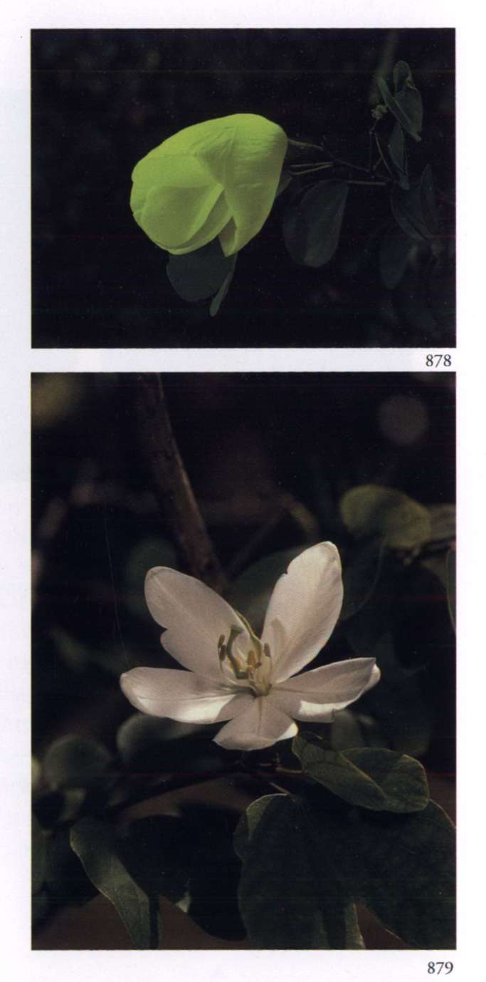 879 Purified gold It is purified by being placed at the service of the Divine. Bauhinia acuminata L. Leguminosae (subfamily Caesalpinioideae) Dwarf white bauhinia Medium-sized pure white saucer-shaped flower with five broad petals and conspicuous golden anthers; borne in very short racemes. A medium to large shrub with the camel's-foot leaves typical of the genus.