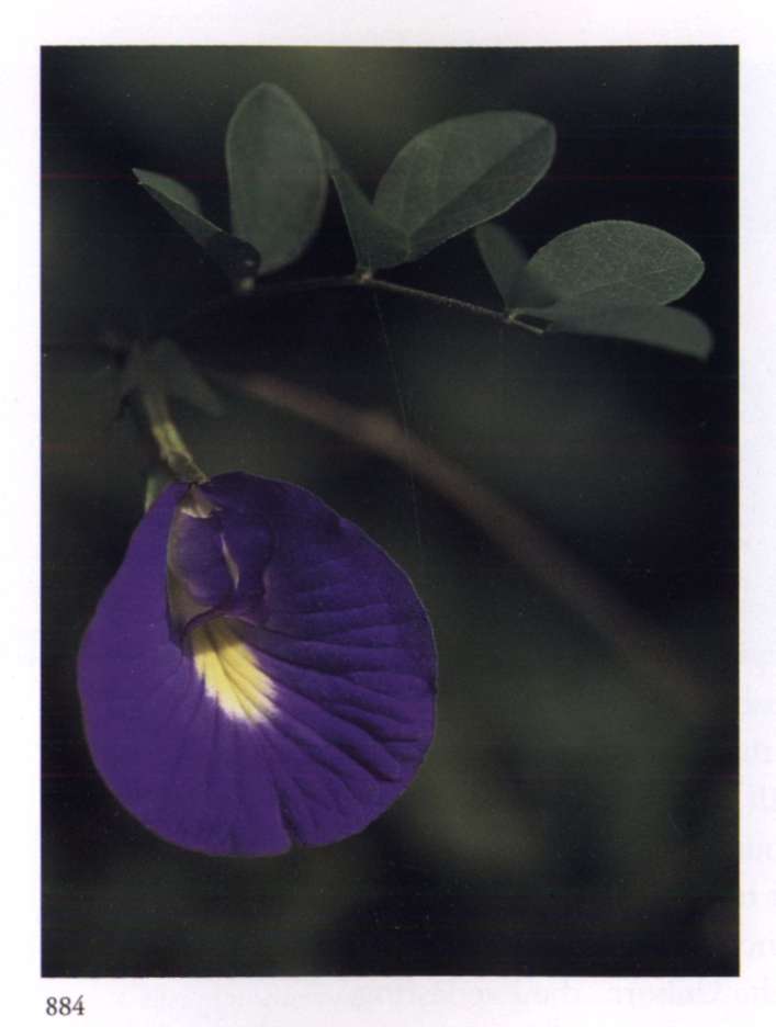 884 Radha's consciousness Symbolises perfect attachment to the Divine. Clitoria ternatea L. Leguminosae (subfamily Papilionoideae) Blue pea, Blue vine, Butterfly pea, Pigeon wings, Mussel-shell creeper Medium-sized single or double ultramarine blue papilionaceous flower that has a broad oval central petal with a yellow centre and wing petals edged with pale blue; borne singly on a short stem. A slender perennial vine with beanlike pods. Early names: Integral Radha's consciousness (double blue); Devotional movement in Radha's consciousness (light blue with mauve)