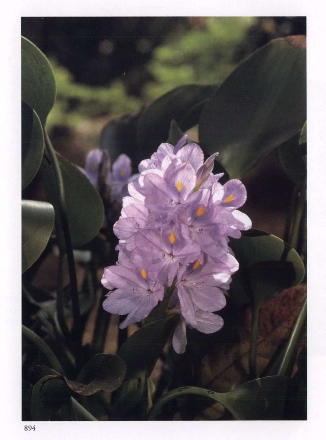 894 Krishna's play in the vital In His midst it has all its charm. Eichhornia crassipes (Mart.) Solms-Laub. Pontederiaceae Water hyacinth, Water orchid Showy medium-sized light lavender six-petalled flower with one upper petal that has a yellow spot surrounded by blue and rose lavender and resembles a peacock feather; borne on a dense erect spike. A prolific aquatic herb with inflated leaf-bases and feathery roots.