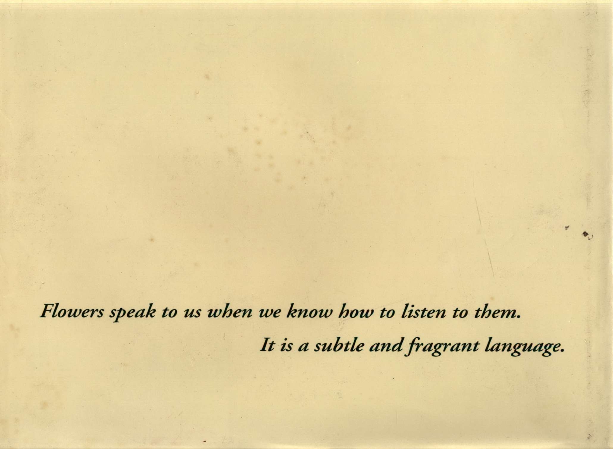 Not as we understand it mentally. There is a mental projection when one gives a precise significance to a flower. ... A flower does not have the equivalent of a mental consciousness. ... It is rather like the movement of a little baby, neither a sensation nor a feeling, but something of both; it is a spontaneous movement, a very special vibration. Well, if one is in contact with this vibration, if one feels it, one receives an impression which may be translated by a thought. This is how I give a significance to flowers and plants. There is a kind of identification with the vibration, a perception of the quality it represents, and gradually through a kind of approximation (sometimes it comes suddenly, occasionally it takes time) there is a convergence of these vibrations, which are of a vital-emotional order, and the vibration of mental thought, and if there is sufficient accord one has a direct perception of what the plant may signify.