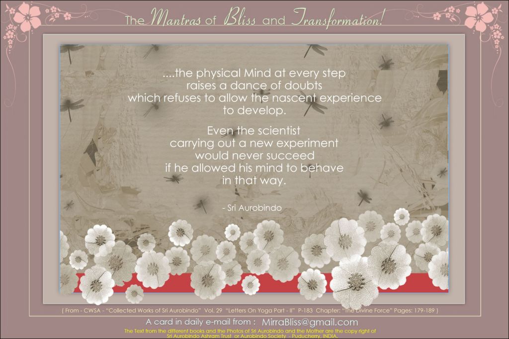 For, in books of this kind (Mother shows The Synthesis of Yoga), books of revelation, there is always an accumulation of forces - at least of higher mental forces, and most often of spiritual forces of the highest knowledge. Every book, on account of the words it contains, is like a small accumulator of these forces. People don't know this, for they don't know how to make use of it, but it is so. In the same way, in every picture, photograph, there is an accumulation, a small accumulation representative of the force of the person whose picture it is, of his nature and, if he has powers, of his powers. Now, you, when you are sincere and have an aspiration, you emanate a certain vibration, the vibration of your aspiration which goes and meets the corresponding force in the book, and it is a higher consciousness which gives you the answer.
