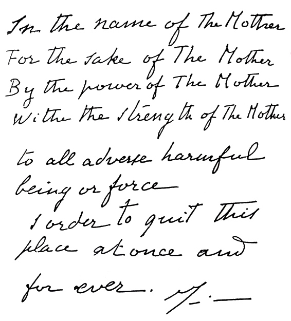 In the name of The Mother For the sake of The Mother By the power of The Mother With the strength of The Mother to all adverse harmful being or force I order to quit this place at once and forever. - The Mother