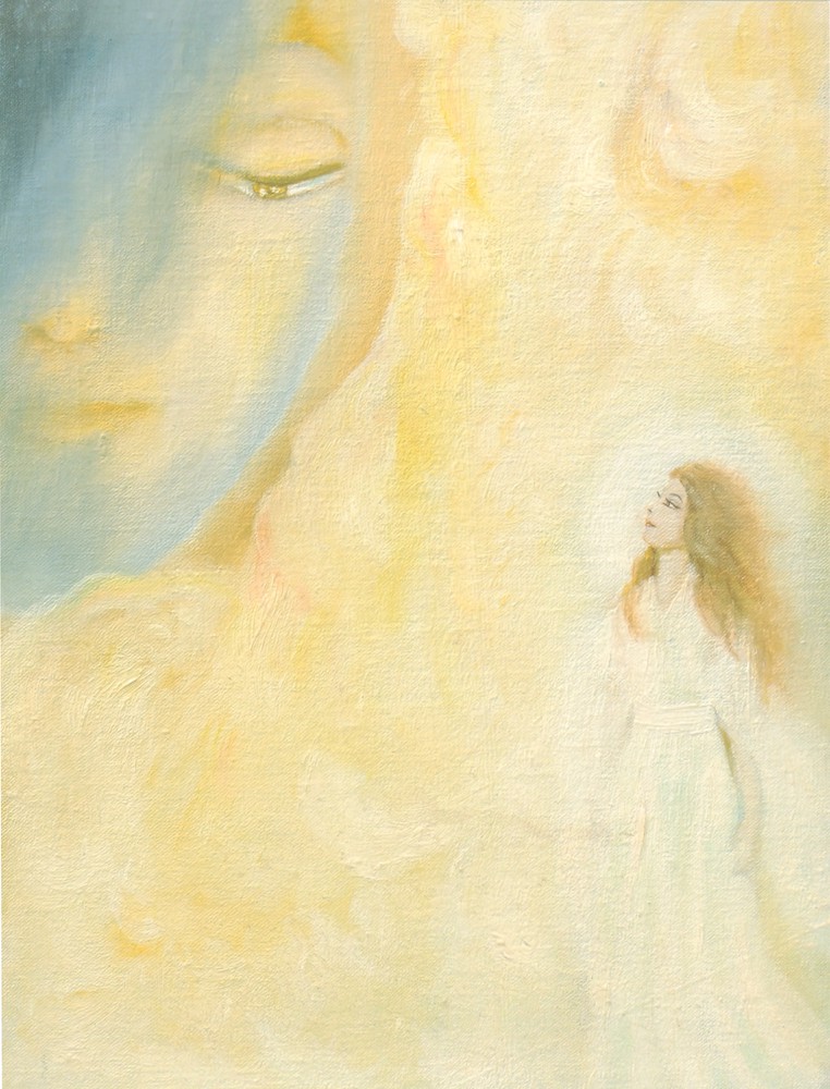 Limitless like ocean round a lonely isle A second time the eternal cry arose: Wide open are the ineffable gates in front.... ||153.43|| Immeasurably the woman’s nature spoke: Thy oneness, Lord, in many approaching hearts.... ||153.46|| A third time swelled the great admonishing call: I spread abroad the refuge of my wings.... ||153.47|| A sob of things was answer to the voice, And passionately the woman’s heart replied: “Thy energy, Lord, to seize on woman and man, To take all things and creatures in their grief And gather them into a mother’s arms.” ||153.49||