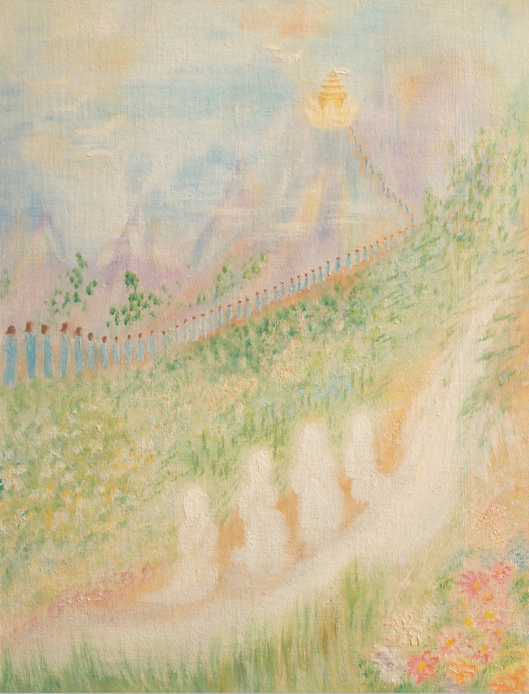 Eternal mountains ridge on gleaming ridge Whose lines were graved as on a sapphire plate And etched the borders of heaven’s lustrous noon Climbed like piled temple stairs and from their heads Of topless meditation heard below The approach of a blue pilgrim multitude And listened to a great arriving voice Of the wide travel hymn of timeless seas. ||148.15||