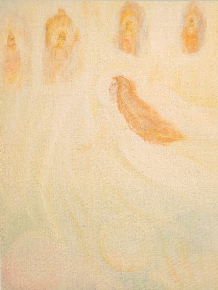 Endless aspired the climbing of those heavens; Realm upon realm received her soaring view.... ||148.38|| Immune she beheld the strong immortals’ seats Who live for a celestial joy and rule The middle regions of the unfading Ray. ||148.39|| Great forms of deities sat in deathless tiers, Eyes of an unborn gaze towards her leaned Through a transparency of crystal fire. ||148.40||