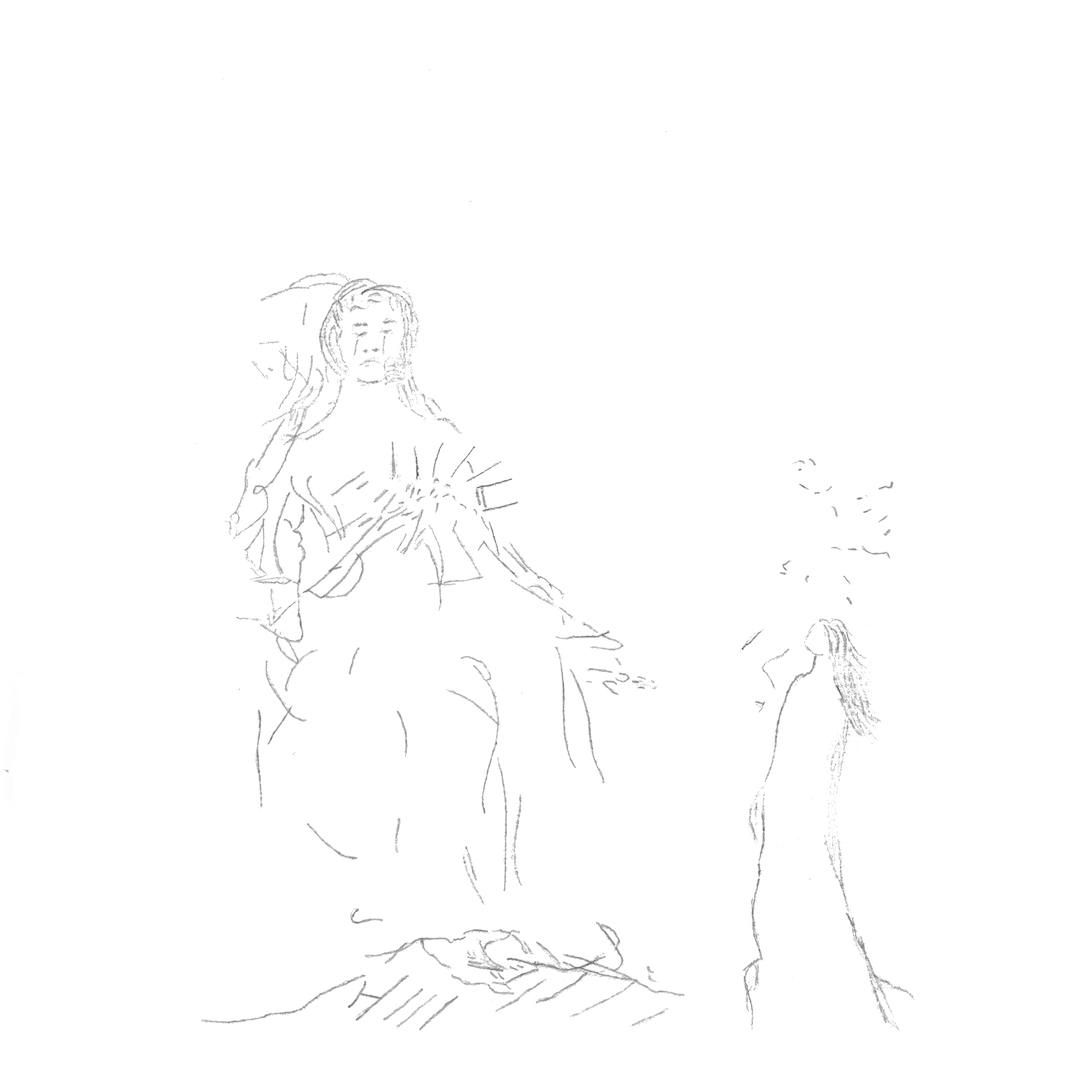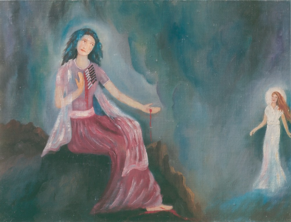 Here from a low and prone and listless ground The passion of the first ascent began; A Woman sat in a pale lustrous robe.... ||122.1|| The Mother of the seven sorrows bore The seven stabs that pierced her bleeding heart... ||122.4|| In soft sweet training words slowly she spoke: “O Savitri, I am thy secret soul. ||122.6|| To share the suffering of the world I came, I draw my children’s pangs into my breast.... ||122.7|| I am the hope that looks towards my God, My God who never came to me till now; His voice I hear that ever says `I come’: I know that one day he shall come at last.” ||122.22||