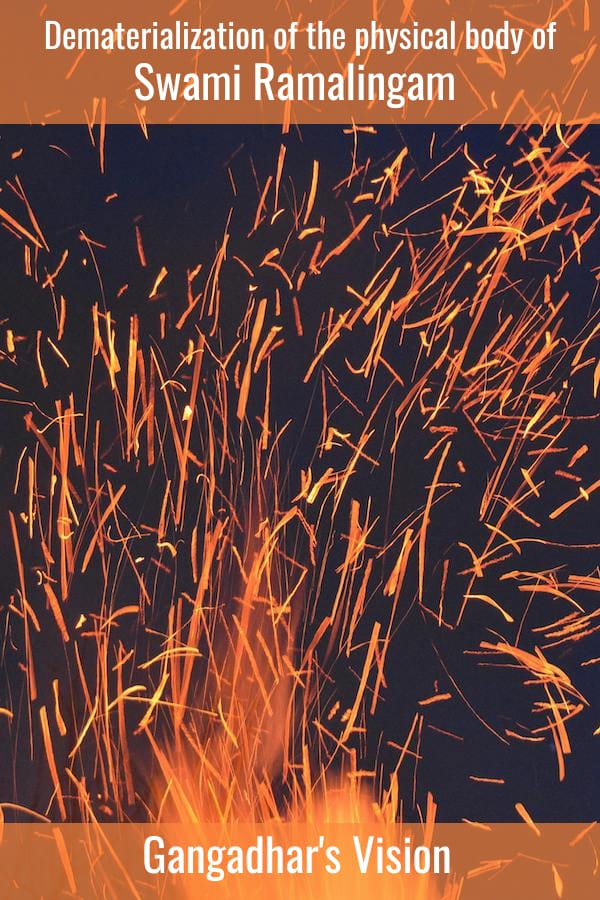 Gangadhar's vision of dematerialization of the physical body of Swami Ramalingam into & as the Truth-Light of Supreme Grace. Translated from the original Tamil.