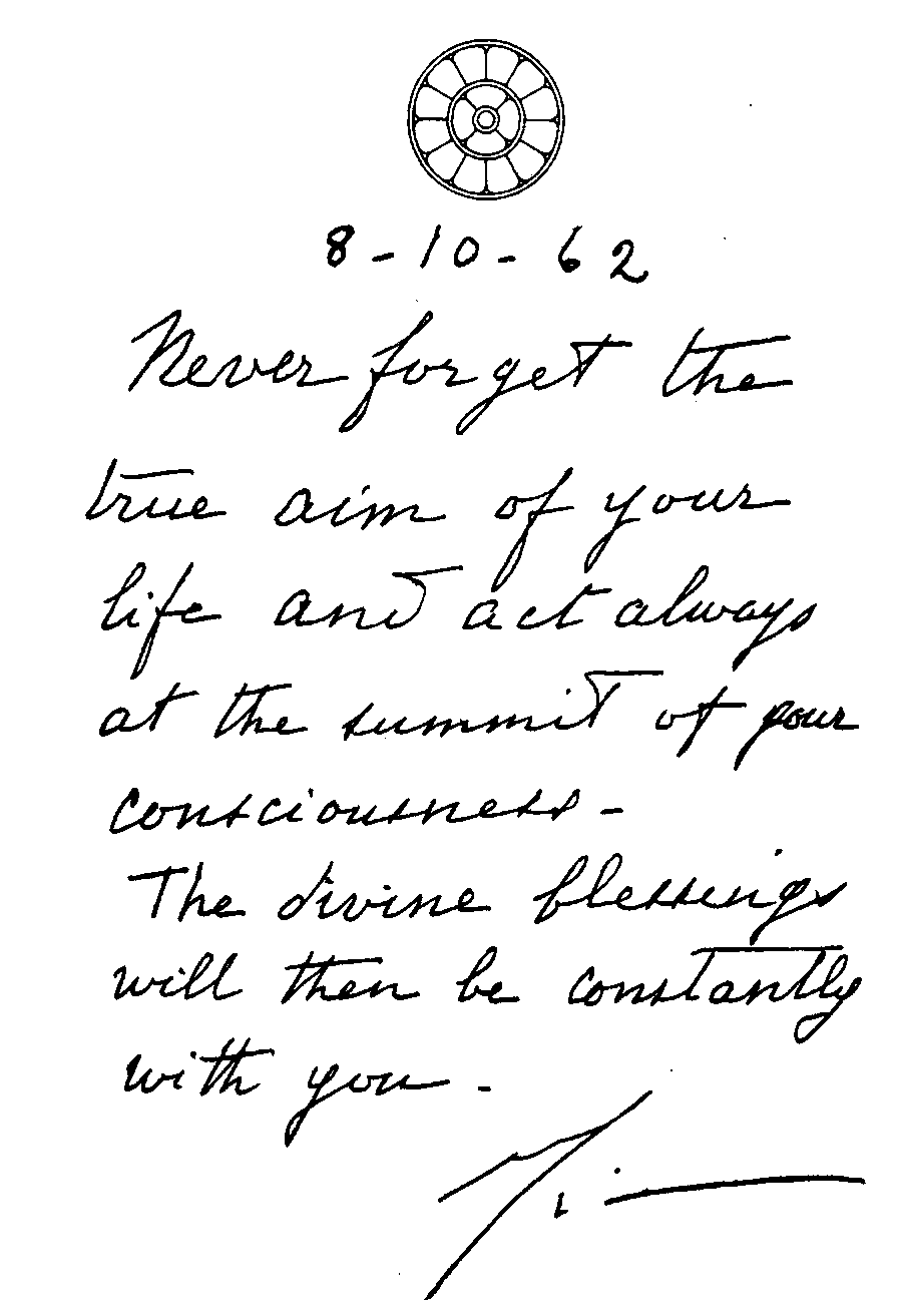 Sri Aurobindo and the Mother gave Kamalaben the following messages on her birthday in 1946: