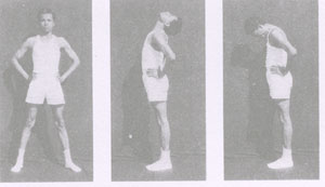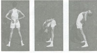 Starting position: Stand erect, feet apart, hands behind the head (elbows pulled back).
