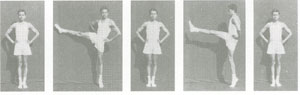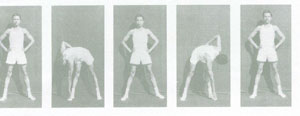 Starting position: Stand erect, feet apart, back of hands on the small of the back.