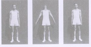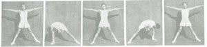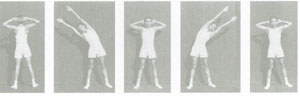 Starting position: Stand erect, feet wide apart, arms raised sideways.
