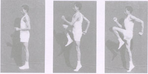 (iii) Raise the right leg forward (kick the foot as high as possible). Breathe in.