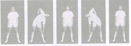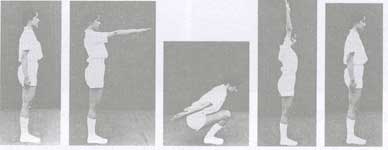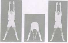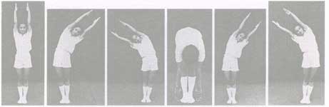Starting position: Stand erect, feet well apart, arms stretched overhead.