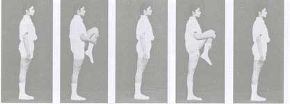 (i) Lift the left knee as high as possible. Grasping the knee and the shin with both hands, pull the leg towards the body. Keep the back straight throughout. Breathe in.