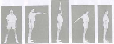 Starting position: Stand erect, feet together, arms stretched overhead, palms facing in.