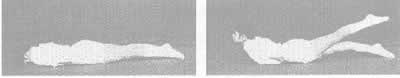 (i) Simultaneously raise the head, shoulders and left leg as high as possible off the floor. Keep the legs straight. Breathe in.
