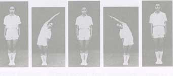 (ii) Swing the trunk laterally to the right, then down, left and upward describing a complete circle to finish with the trunk bent laterally to the right. Breathe out while moving downward and breathe in while moving upward. Repeat on the other side.
