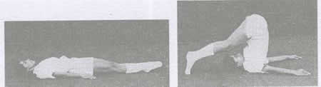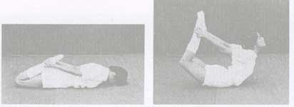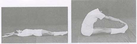 (ii) Keeping the body taut, roll forward on the chest by bending the elbows and simultaneously arch the back and raise the legs high keeping them straight and together. Breathe out.
