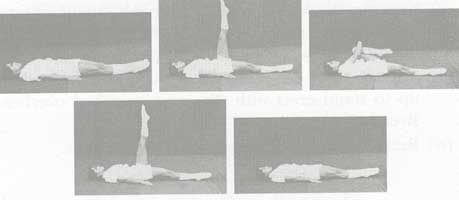 (ii) While slowly lowering the left leg raise the right leg till it is at a right angle. Breathe out.