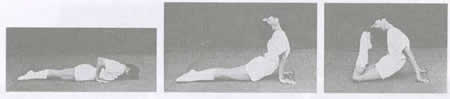 (i) Pull the knees upward and outward as much as possible, and arching back make a wheel with the body. Breathe in.