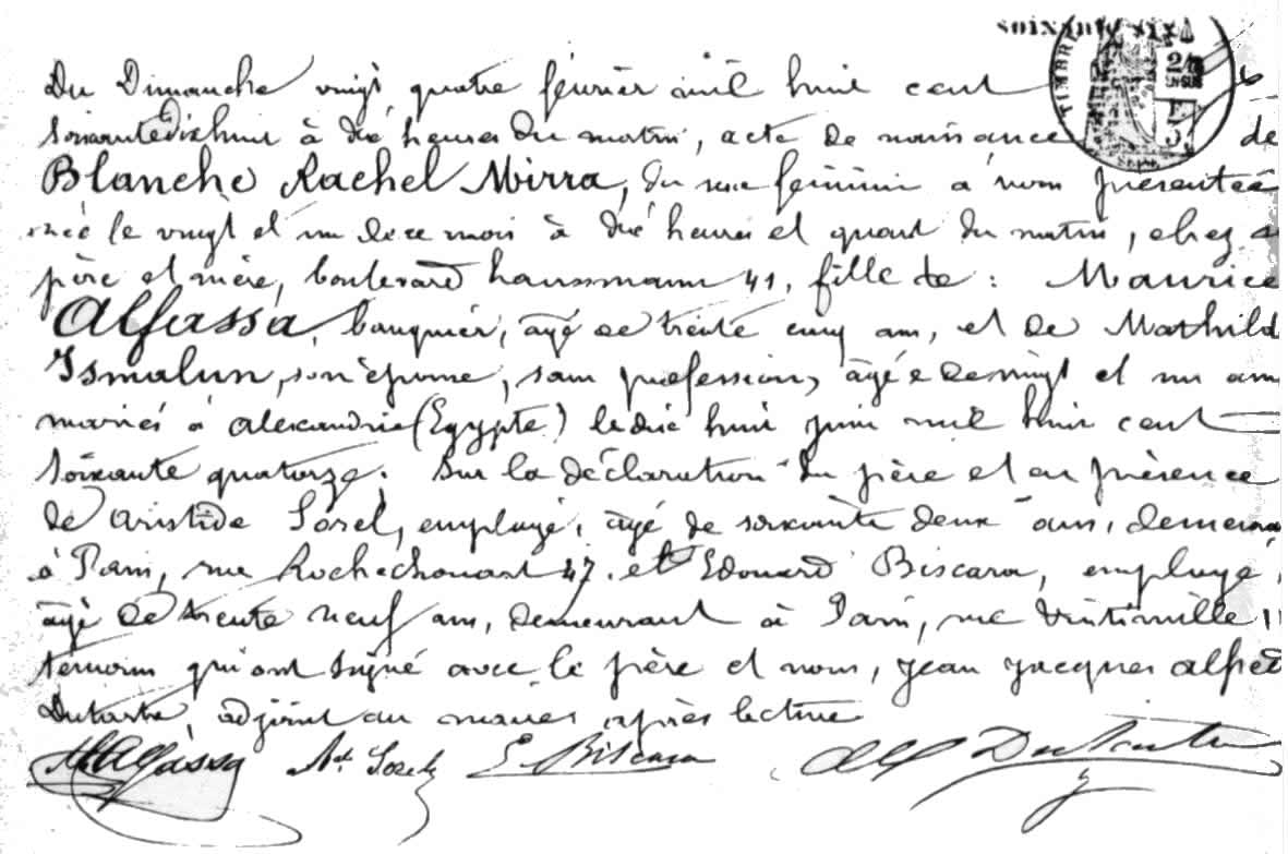 This Sunday 24 February 1878 at 10 a.m., birth certificate of BLANCHE RACHEL MlRRA, of female sex, surname as under, born the 21st of this month at 10:15 a.m., at the home of her father and mother, 41 Boulevard Haussmann, daughter of: Maurice ALFASSA, banker, aged thirty-five, and Mathilde ISMALUN, his spouse, housewife, aged twenty-one, married at Alexandria (Egypt) on 18 June 1874. Under notification of the father, in the presence of the witnesses Aristide Sorel, employee, aged sixty-two, residing at Paris, 47 Rue Rochechouart, and Edouard Biscara, employee, aged thirty-nine, residing at Paris, 11 Rue Vintimille, who have signed with the father and me, Jean-Jacques Alfred Dutartre, deputy mayor. Read and approved: