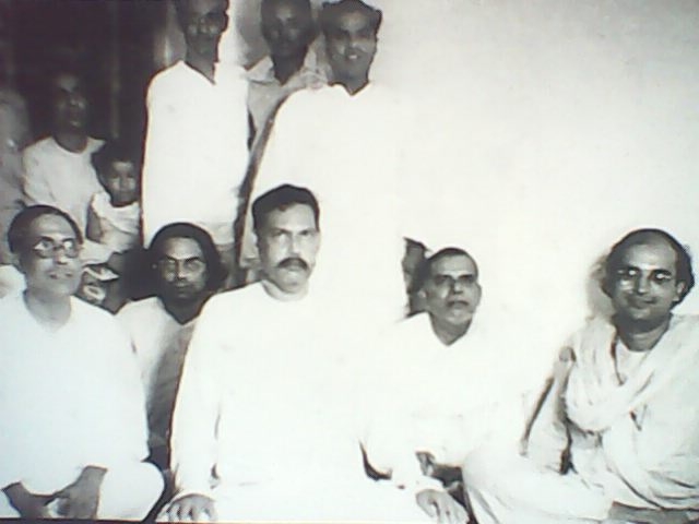 Nolini Kanto Sarkar seated at the back with his youngest daughter Bokul, Kazi Nazrul Islam, Barada Charan Majumdar, Upendranath Banerjee & Dilip Kumar Roy