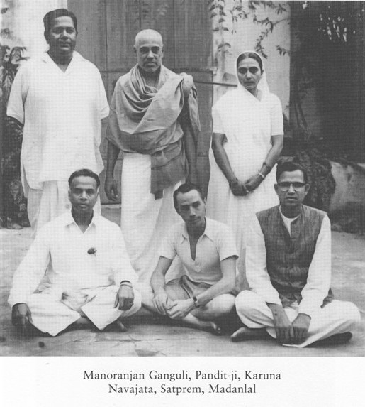 (L to R) Manoranjan Ganguli, Panditji, Karuna (L to R - seated) Navajata, Satprem, Madanlal