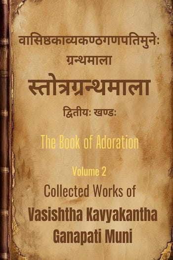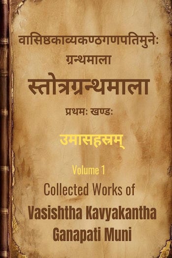 A scholar poet, Sri Vasishta Ganapati Muni has many spiritual and other writings in Sanskrit to his credit. Umasahasram, gitamala, ramanagita, ramanacatvarimshat and saddarshanam are a few titles well-known among his disciples and others. But very little is known about his other numerous Sanskrit writings, covering a wide variety of topics: praises and prayers to various deities (stotras), poetic compositions (kavyas), philosophy (darshana), logic (nyayashastra), medical science (ayurveda), astrology and astronomy (jyotishashastra), commentaries (bhashya), novel (akhyayika), letters (patrani) and other research works. His versatility can also be judged from his writings samrajyanibandhanam (a proposed constitution for India) and lalibhashopadesha (a new language for the Indian people). He was spontaneous in composing all these either in verse form (shlokas) or in the form of aphorisms (sutras) or prose form (gadya). Nevertheless, all these were the result of his tapas, an outpouring of his soul in seeking or gratitude to the Divine.